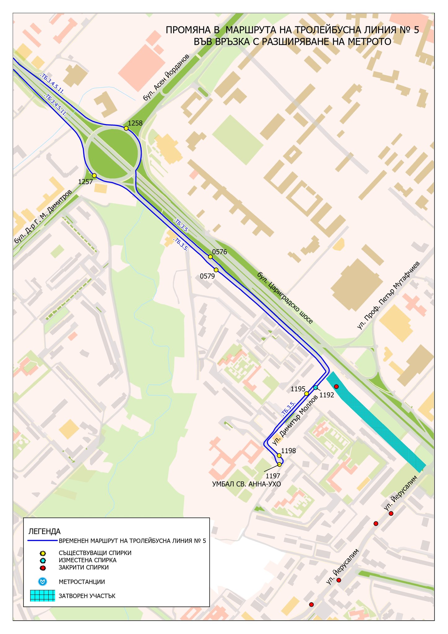 Маршрутът на тролейбусна линия № 5 се скъсява до УМБАЛ „Св. Анна“. Тролеите ще се движат от надлез „Надежда“ по действащия маршрут до кръстовището на локалното пътно платно на бул. „Цариградско шосе“ с ул. „Димитър Моллов“ и надясно по ул. „Димитър Моллов“ до крайната станция на тролейбусна линия № 3 двупосочно. СХЕМА 2