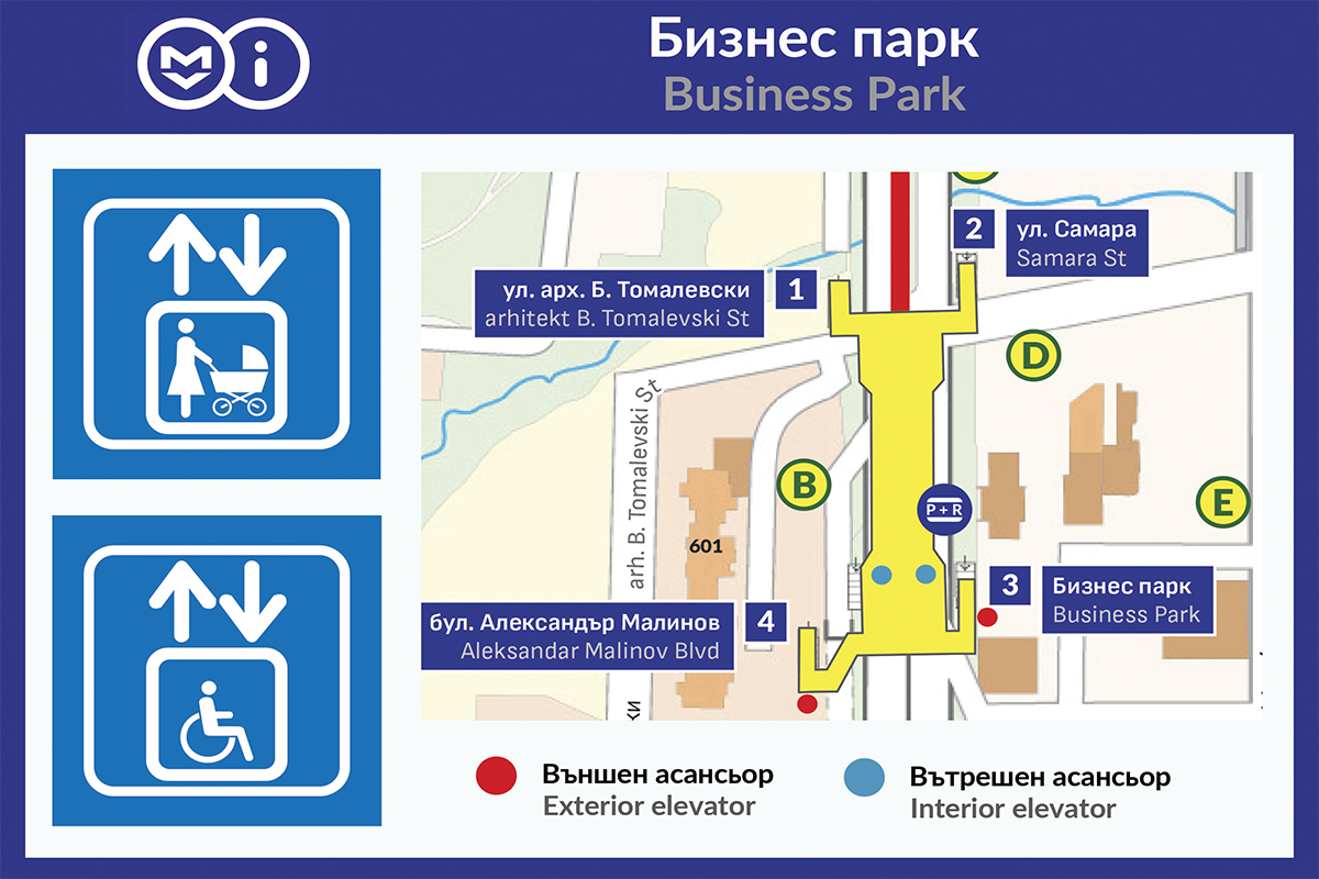 Метростанция „Бизнес парк" започва от кръстовището на бул. "Ал. Малинов" и ул. "Самара" в ж.к. Младост I и продължава до Бизнес парка в ж.к. Младост IV. Тя е решена с два вестибюла на първо подземно ниво (северен и южен), всеки с по два входа. На първо и второ подземно ниво е развит паркинг, достъпът до който е осигурен с две външни и една вътрешна рампа. За паркинга е предвиден и междинен вход/ изход. На трето подземно ниво е перонът на станцията, до който се достига по стълби и ескалатори от вестибюлните пространства. Южният вестибюл разполага и с асансьор.